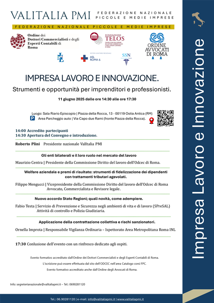 Mercoledì 11 giugno 2025, dalle ore 14,30 alle 17,30, presso la Sala Riario Episcopio di Ostia Antica avrà luogo il Convegno “Impresa, lavoro e innovazione”, organizzato da ValItalia PMI con la partecipazione dell’ODCEC – Ordine dei Dottori Commercialisti e degli Esperti Contabili di Roma e dell’Ordine Avvocati di Roma.